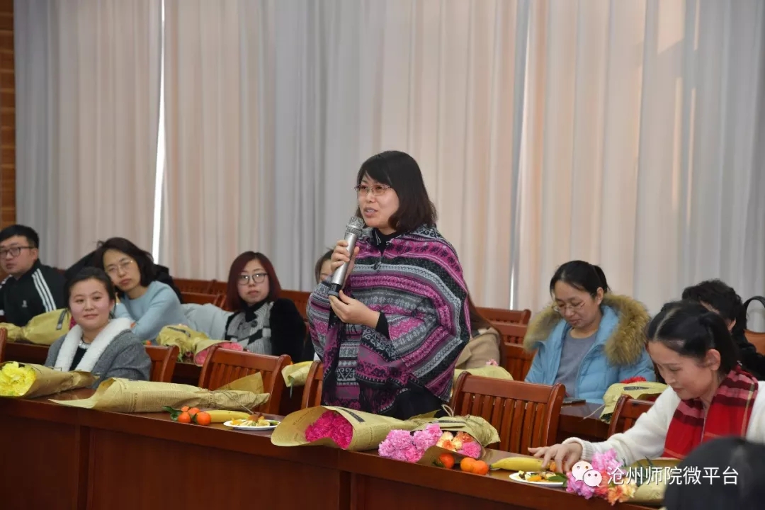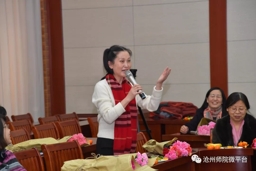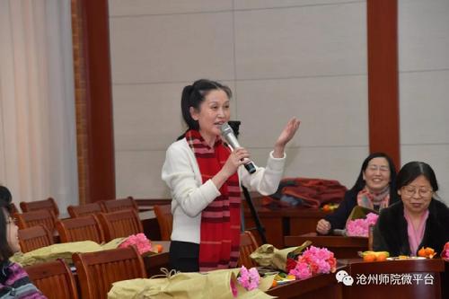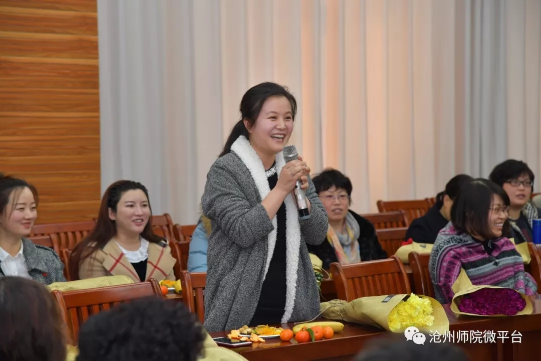 座谈会充满欢声笑语,与会代表围绕如何立足岗位、更好地发挥女教职工在学校事业发展中的作用,如何在生活、工作中扮演好自己的角色等进行了座谈交流。教育学院副院长何兰芝说:“2017年是师院发展的历史节点,在这奋斗的一年中,我们有压力更有收获,更应深刻思考如何扮演好女性在生活、工作中的多重角色,并付出努力。”化学学院教授刘长霞说:“在师院迎来新发展的新时代,我们的自豪写在脸上,自信藏在心中。今后的工作中,应进一步发挥女教师易与学生沟通的先天优势,克服知识更新速度慢、宽度不够的缺陷,在教学科研岗位上再立新功。”生命科学学院副教授李荣华说:“在师院,我获得了强烈的归属感,见证了学校的成长,学校也给了我足够的空间,更从容、更稳健地经营自己和家庭。”大家你一言我一语,谈感受、讲经历、话发展,演节目,整个座谈会场气氛热烈融洽。