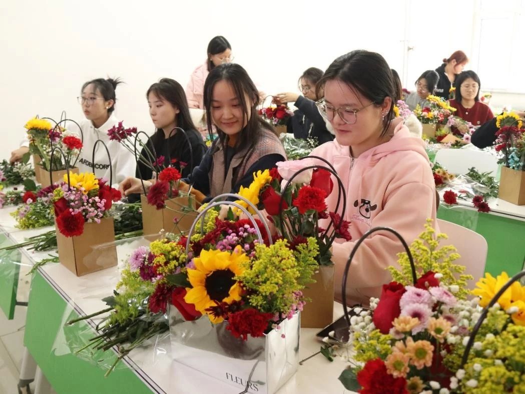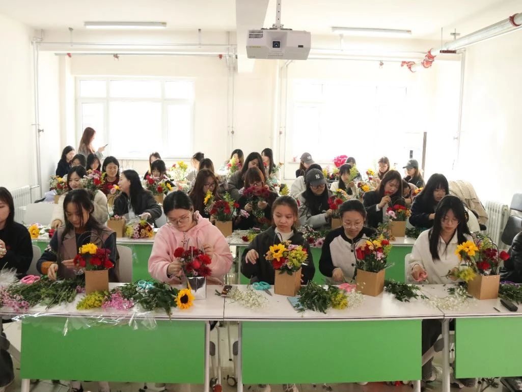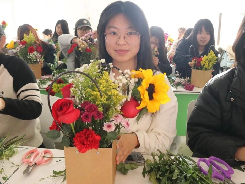 在花艺师的悉心指导下,同学们纷纷动手尝试,小心翼翼地挑选花材,认真地修剪花枝,专注构思花束的形状。经过同学们的巧手装扮,一束束美丽而富有创意的花束逐渐展现在眼前。看着自己亲手制作的作品,同学们脸上洋溢着满足和喜悦的笑容。