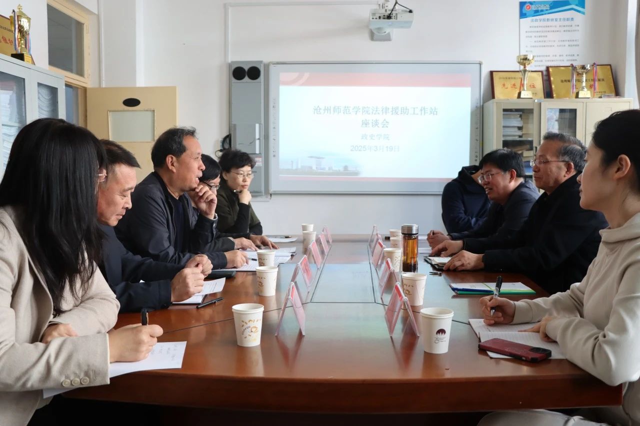 3月19日,司法厅一级巡视员孟相维、省法援中心主任刘峥嵘、沧州市司法局党组书记王鹏、沧州市法援中心主任及元戎到我校调研法律援助工作站建设工作。党委副书记范小振带领我校政史学院全体班子成员接待了调研组一行。