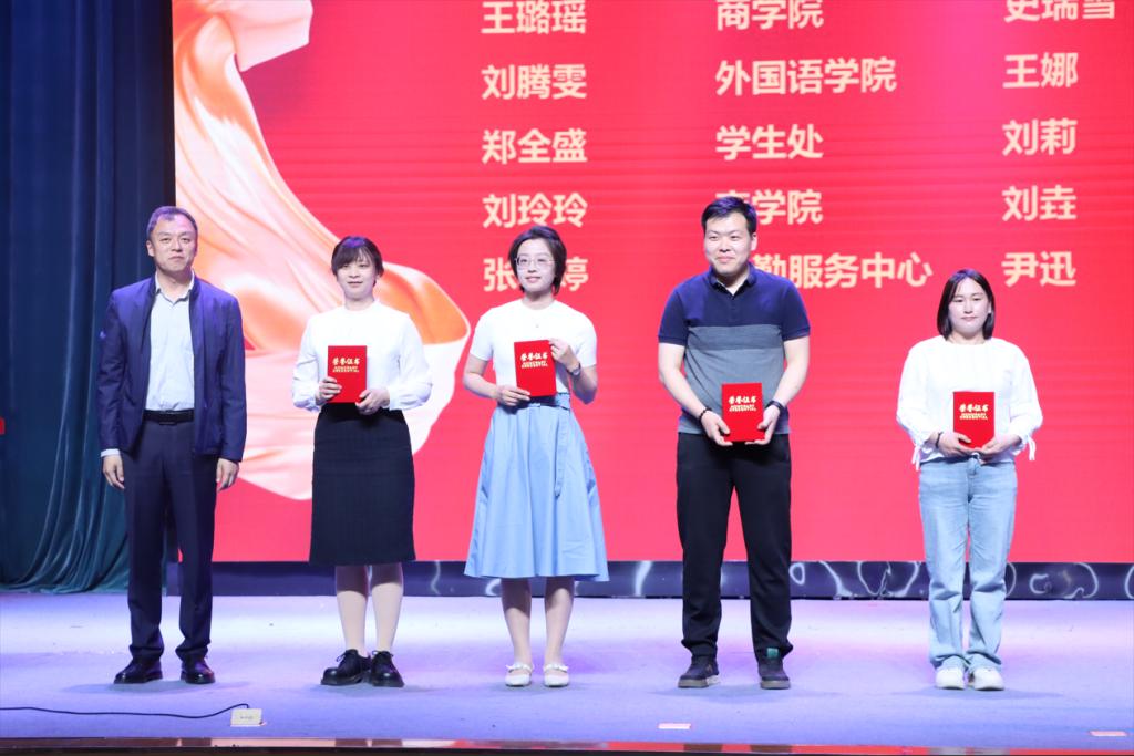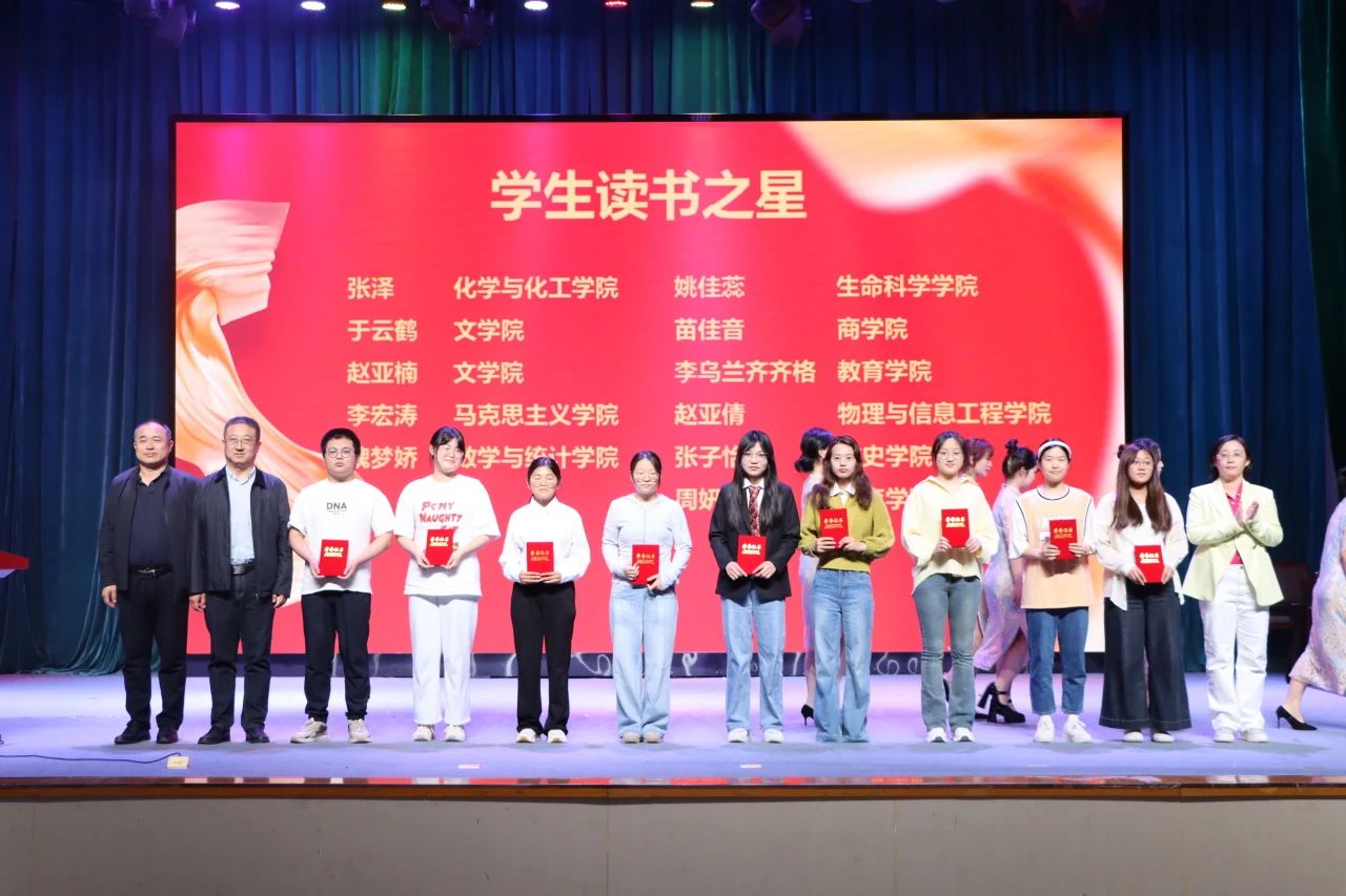 朱蓬华及党委宣传部部长李健、团委书记李倩、学生处处长辛智广向教师读书之星和学生读书之星颁奖。