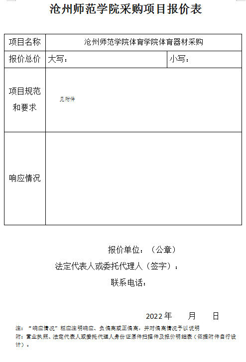 报名方式:响应人将报价信息填入“沧州师范学院采购项目报价表”签字盖章后,连同报价单位营业执照、法定代表人或委托人身份证原件扫描件、盖公章的报价明细表(依据附件自行设计,有偏离的提供实际响应的报价表,并将偏离项用黑体标注)一同发至czsygzc@163.com