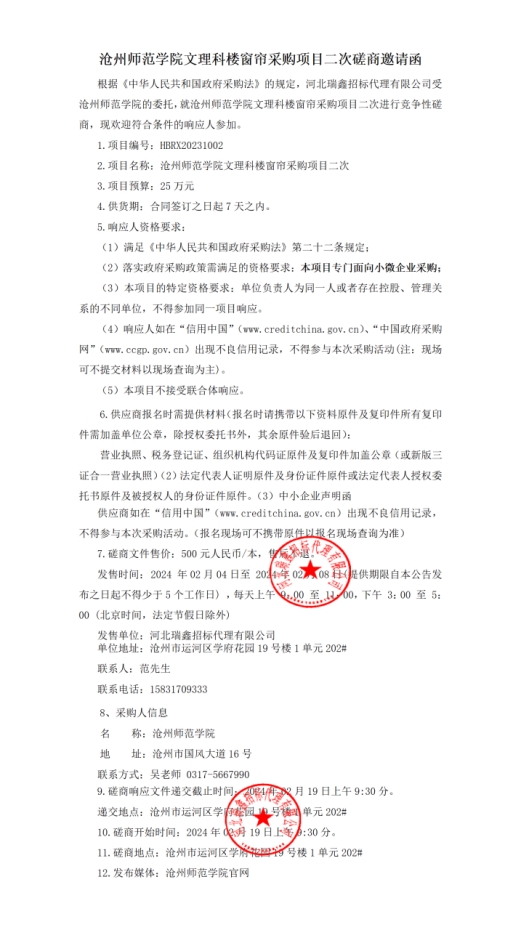 沧州师范学院文理科楼窗帘采购项目二次磋商邀请函