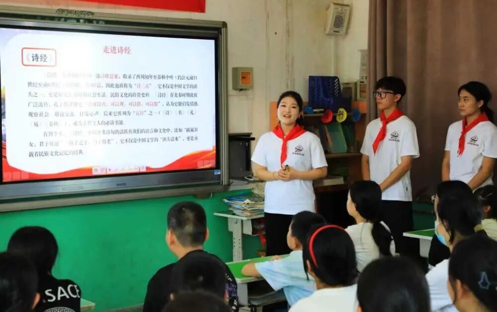 作为文化传承与语言推广的创新载体,“诗音推普”项目打破传统模式,构建“普通话教学+经典诵读+地域文化”三维实践体系。在南皮县大浪淀乡四兴小学,师生带领乡村学子诵读《诗经·秦风·无衣》,将古代战士的家国情怀与抗战精神相呼应,让“开学第一课”成为文化自信培育的生动课堂;在东光县龙王李镇启蒙幼儿园,团队把《诗经·小雅·鹿鸣》改编成儿歌,通过唱跳互动帮幼儿感受语言韵律;在沧县崔尔庄镇后乔庄小学,成员结合《诗经》与沧州的历史渊源,讲解地域故事,还通过传统揖礼教学、实时直播课堂等形式,让文化传承更具感染力。