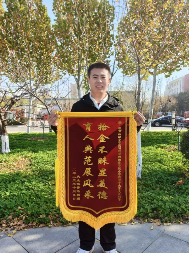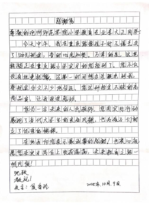 为表达感谢,该家长手写感谢信并定制锦旗送至学校,赞扬李大正品德高尚、作风端正,也肯定了沧州师范学院教育学院在学生品德培养与思想教育上的显著成效。