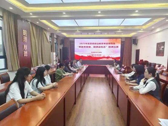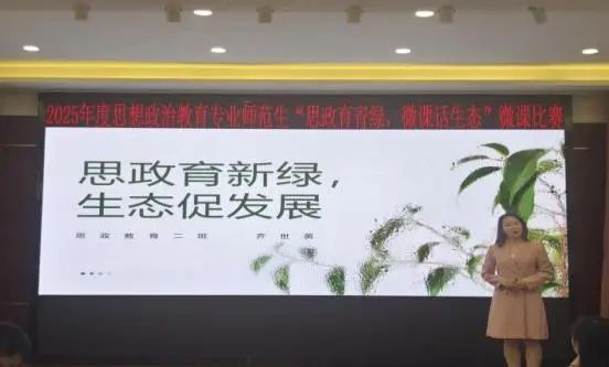为进一步培养师范生教学能力,提升师范生的教学实践能力与生态文明素养,马克思主义学院精心筹备并举办 2025 年度 “思政育青绿,微课话生态”思想政治教育专业师范生微课比赛。4 月 30 日下午,决赛在理论大讲堂举行。