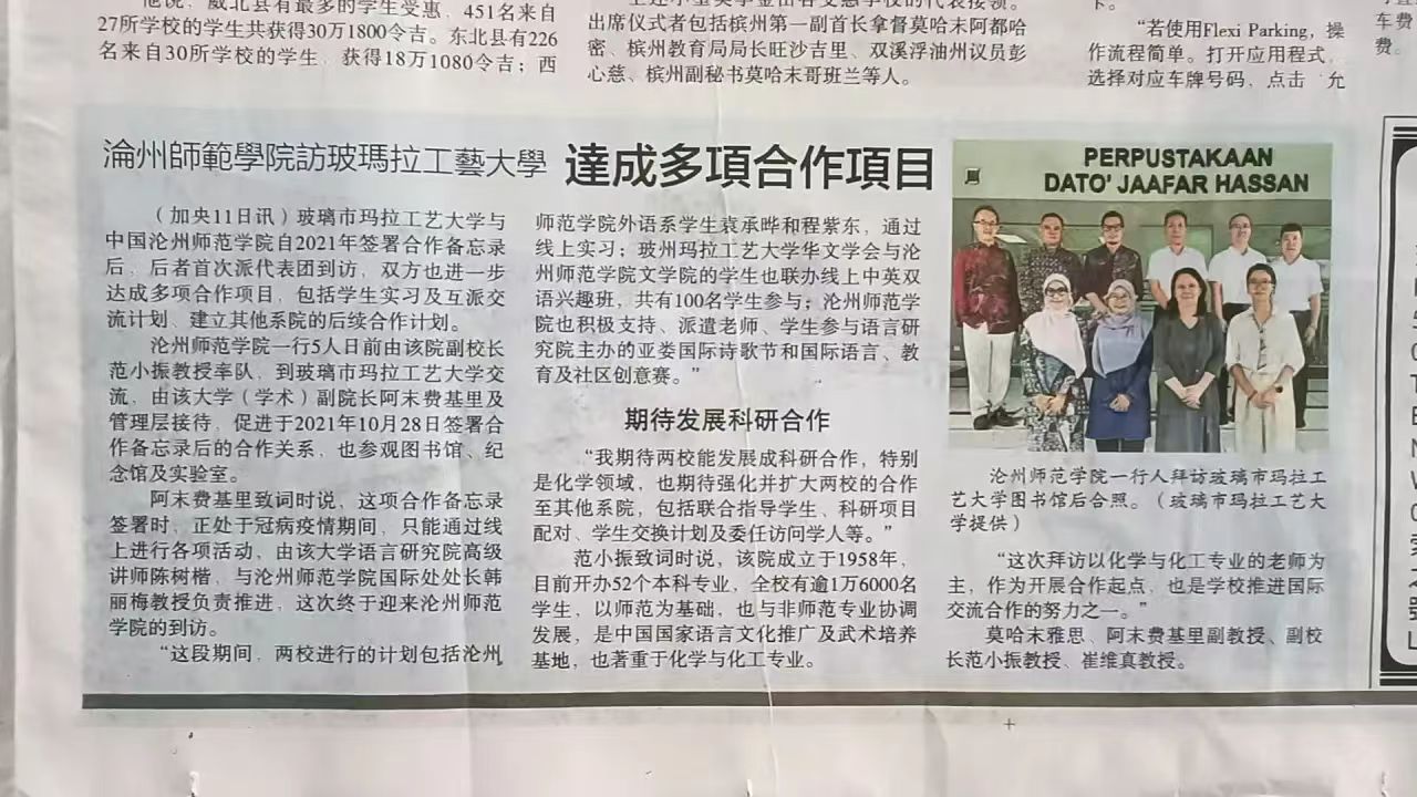 会后,我校代表团与马来西亚玛拉工艺大学玻璃市分校领导举行座谈,双方围绕科研合作、联合指导学生、科研项目配对、学生交换计划及访问学者项目等多项内容展开深入交流,尤其在化学领域达成多项共识,为进一步拓宽合作范围至更多院系奠定坚实基础。此次座谈受到马来西亚多家主流媒体包括《星洲日报》《光明日报》及《光华日报》的关注与报道,彰显出我校在国际学术交流中的积极影响力。