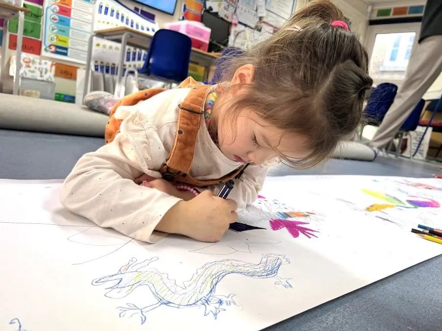 秋令营第一课由国际交流中心主任韩丽梅开启。韩丽梅选取“画龙点睛”成语故事,细致入微地讲述龙的释义、龙的形象、龙的文化,带领小营员在《龙的传人》的歌声中绘出心中的龙。