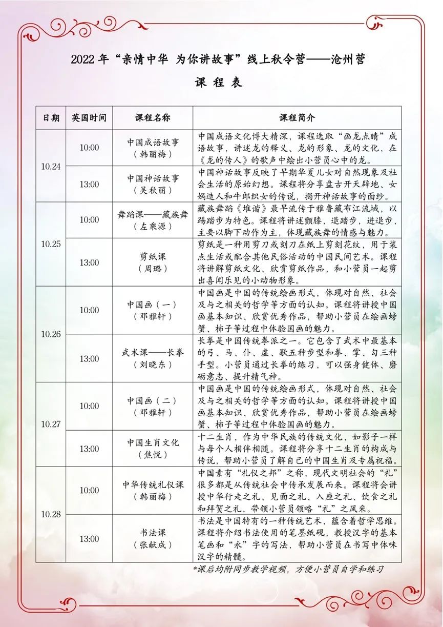 当地时间10月24日13时,由中国侨联主办,河北省侨联、沧州市侨联承办,沧州师范学院协办的“亲情中华·为你讲故事”网上秋令营沧州营顺利开营。来自英国文麟中华文化学校的小营员们云端参与,对中华传统文化展现出浓厚的兴趣。
