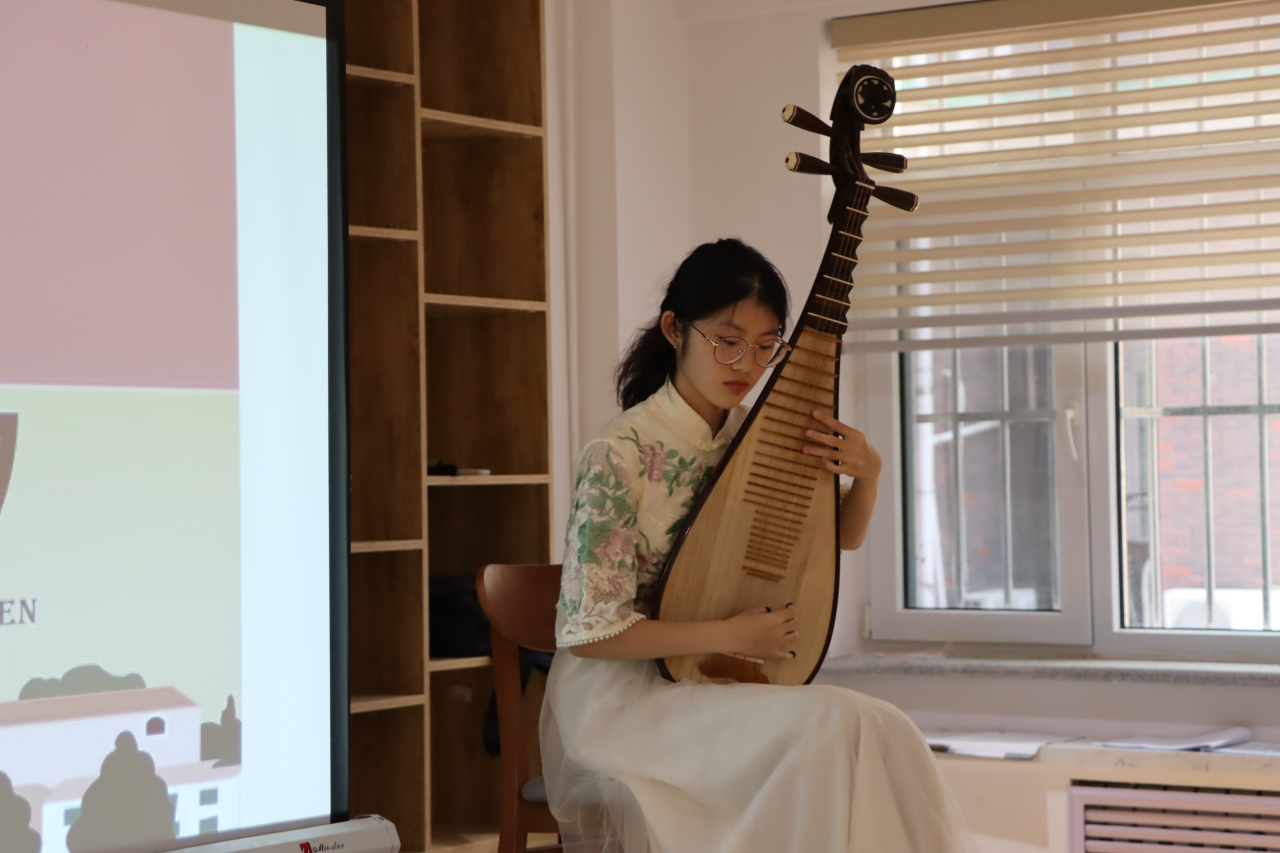 音乐学院学生赵怡帆和张源呈现了中国传统乐器——琵琶和古筝的弹奏技法。