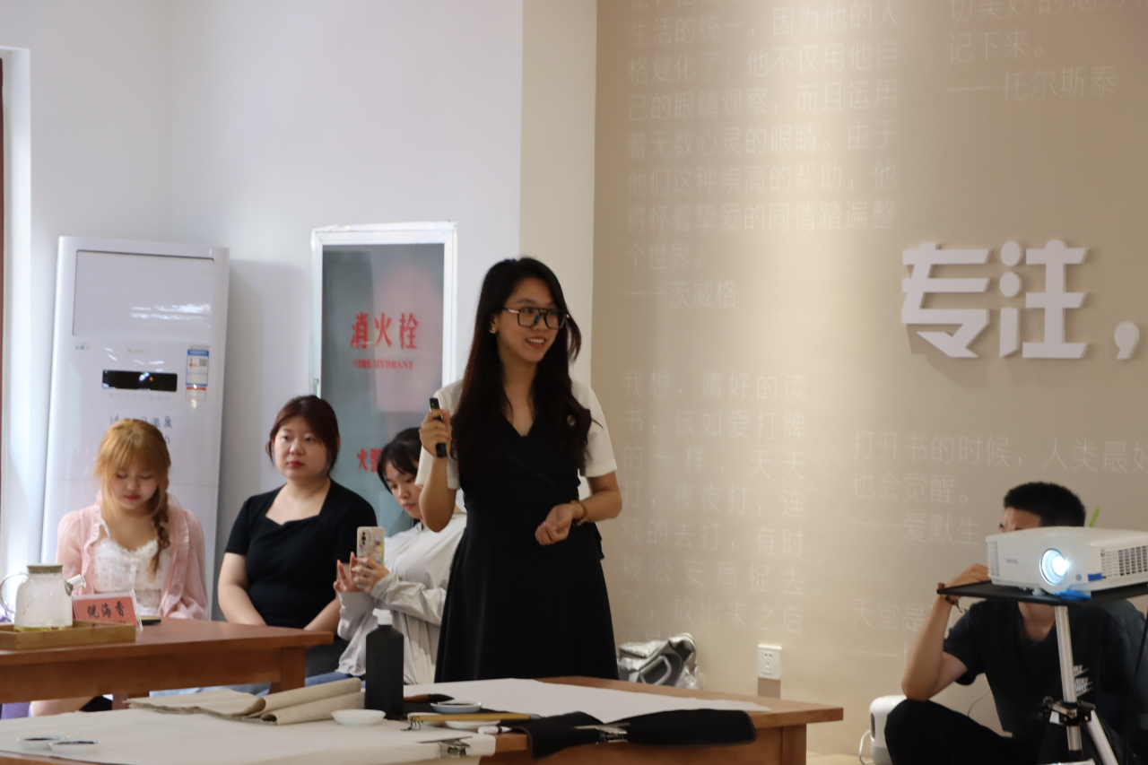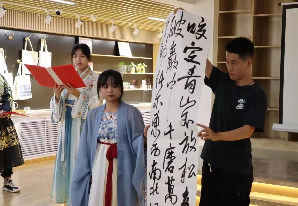 文学院学生付忠澄和张玉欣现场展示书法。