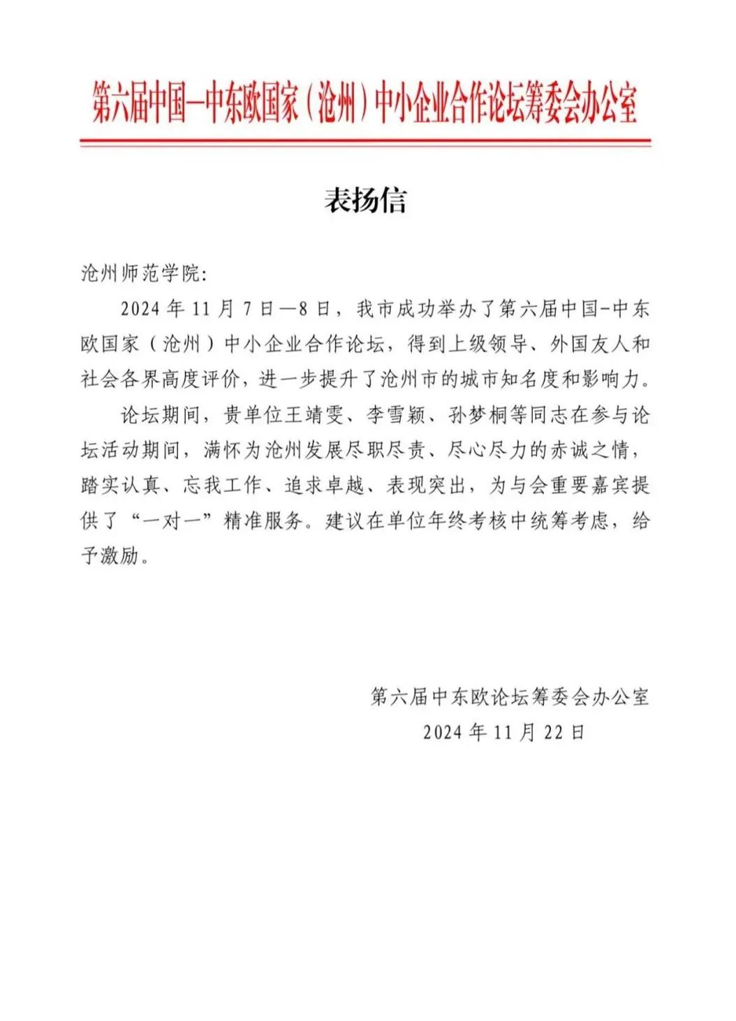 近日,我校收到了第六届中东欧论坛筹委会办公室发来的表扬信,信中表示,我校王靖雯、李雪颖、孙梦桐等同志在参与活动期间,满怀为沧州发展尽职尽责,踏实认真、忘我工作、追求卓越、表现突出,为与会重要嘉宾提供了“一对一”精准服务。