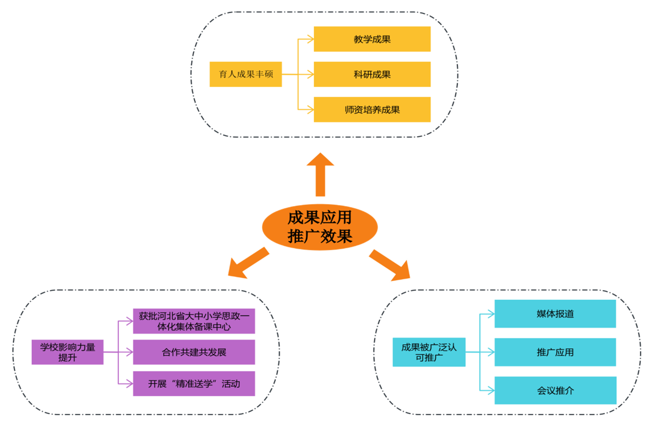马克思主义学院2022年荣获河北省思政课质量评估优秀。案例负责人多次参加省、市、区级会议活动,并多次以专家身份推介成果,对教研活动作点评。部分中小学及高校借鉴本项目成果,将地方红色文化资源融入大中小学思政课一体化建设模式,结合学校特色,打造特色红色主题文化活动。