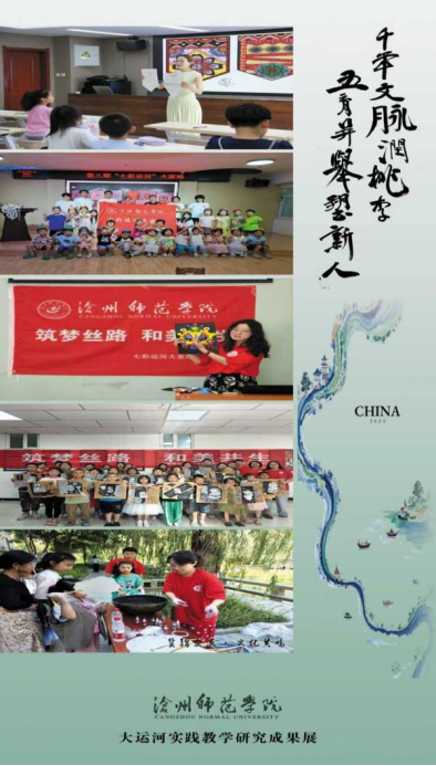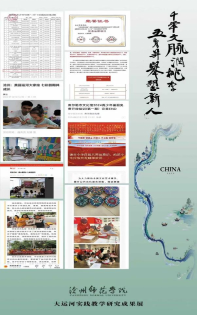 打造“七彩运河大家绘”美育特色品牌,以“弘扬运河文化、厚植家乡情怀”为主线,面向留守儿童、进城务工人员子女等群体开展艺术实践活动,累计参与师生逾百人,直接服务对象超过700人,并面向社会举办三次成果展,积极宣传大运河文化。2023、2024年连续两年被团中央评为全国大学生社会实践重点团队,并荣获2024年河北省大学生和青年教师“体验省情、服务群众”主题活动先进小分队称号。项目还被评为2023年河北省大中专学生暑期“三下乡”社会实践活动特色品牌项目,并获得2024年河北省青年志愿服务大赛优秀奖。活动在沧州及周边地区建立多个实践基地,还深入新疆库尔勒梨花社区、铁门关河北花苑社区、焉耆友好社区等开展服务,被人民日报、人民网、中央广电总台国际在线、新华社、中国教育新闻网、冀云平台、新沧州微平台、巴州电视台等媒体专题报道。