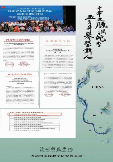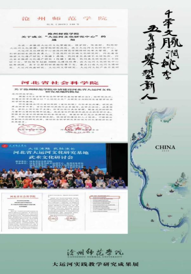 依托学校的河北省大运河文化研究基地,聚焦大运河文化精神阐释、大运河文化保护、资源开发利用等关键领域,立项省、市级科研项目200余项,连续被评为“河北省哲学社会科学优秀研究基地”,成功举办了河北省大运河文化研究基地“武术文化研讨会”;《沧州师范学院学报》设立“大运河文化研究”特色栏目,累计刊发大运河文化精神阐释、非物质文化遗产保护、资源开发与利用等相关主题论文68篇,总下载量达2万余次,形成了较为广泛的学术影响力与社会反响,荣获全国高校社科学术期刊“特色栏目奖”、河北省期刊特色栏目奖;“大运河文化宣讲团”走进沧州市干部培训学院、国学研究会、沧州市图书馆,在政府、社区、学校广泛传播运河文化;7位教师参与沧州电视台《运河印记》栏目,将专项研究成果转化为大众传播内容,相关提案、决策咨询报告被市政协、市人大采纳。